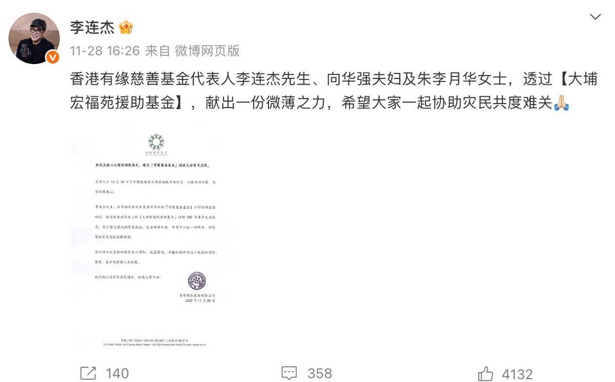2025年11月香港大埔火灾后,他还联合向华强夫妇捐出300万港币,用于灾民安置和生活物资补给,没有通稿刷屏,没有合影炒作,只在社交平台简单官宣,这份低调务实的态度,也让他收获了不少好评。